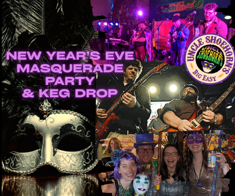 It’s a funky New Year’s Eve Masquerade Party with Uncle Shoehorn…and the 11th annual countdown to midnight Keg Drop!
